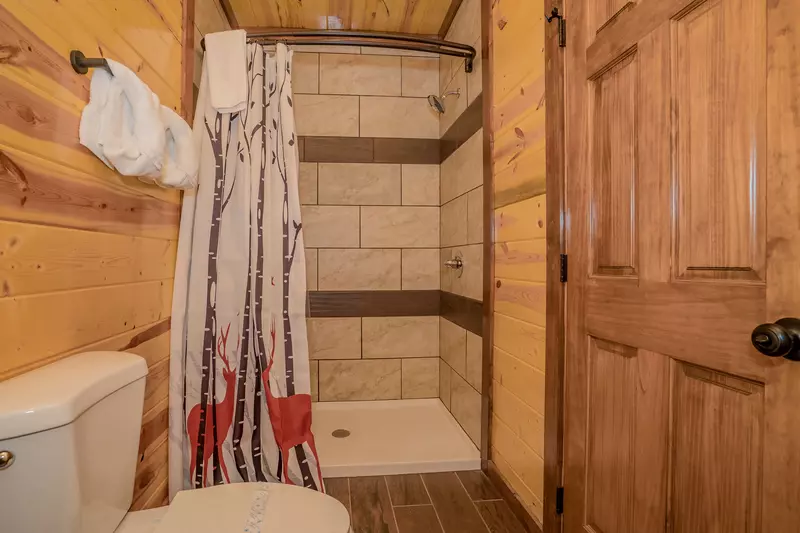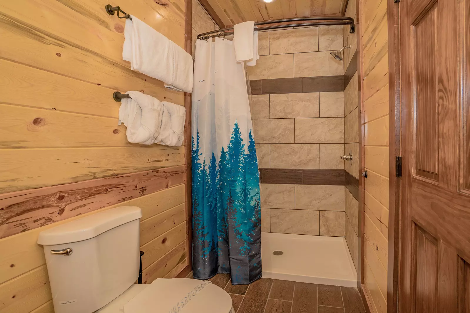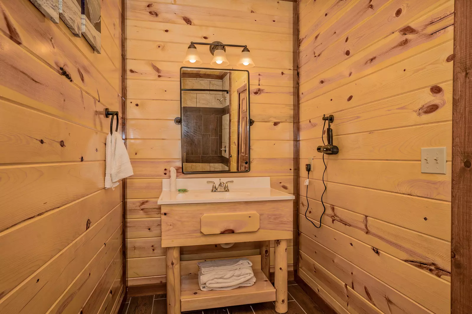The game room features a pool table, foosball game, bar seating for 6 and a fridge to keep the drinks cold while having fun. There is also a washer and dryer on this level for your convenience. Grab a float and relax in the indoor pool or let the young and young at heart make memories splashing in the comfort of their very own cabin in the Smokies!