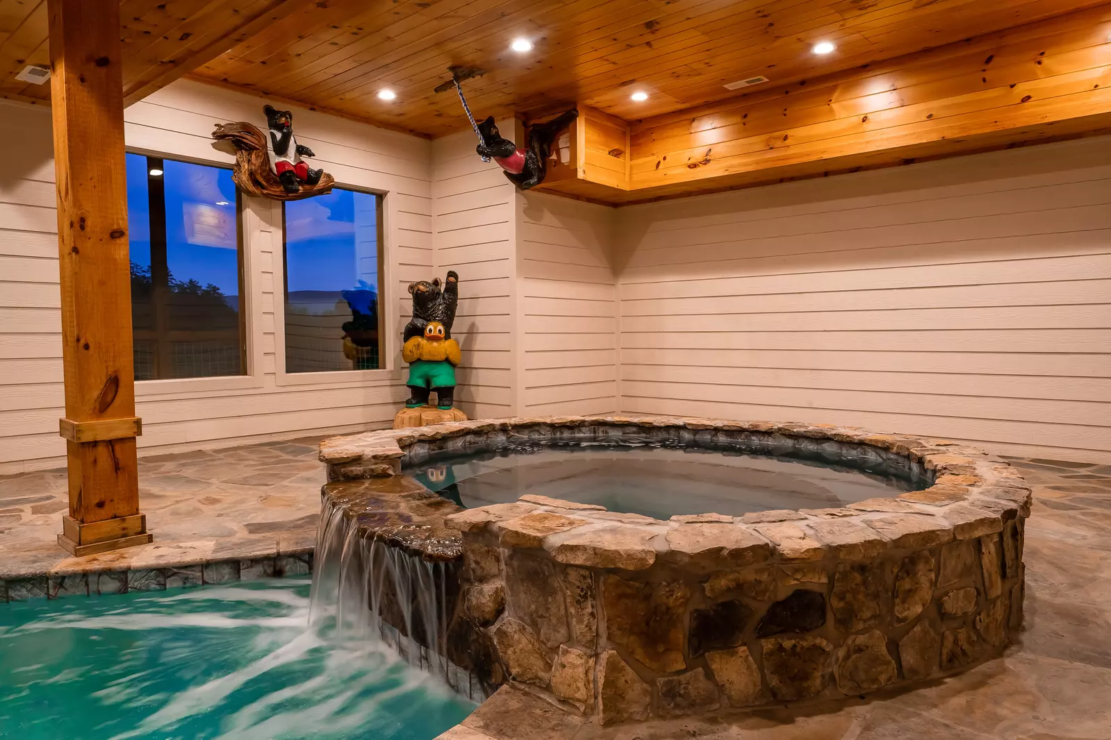 The custom indoor pool includes a jetted lounge and waterfall feature, with a depth transition from 3 to 4 feet, perfect for all ages. Local artisan-carved bear sculptures add a unique charm to the pool area. A half bath and seating area with TV complete this level’s amenities.